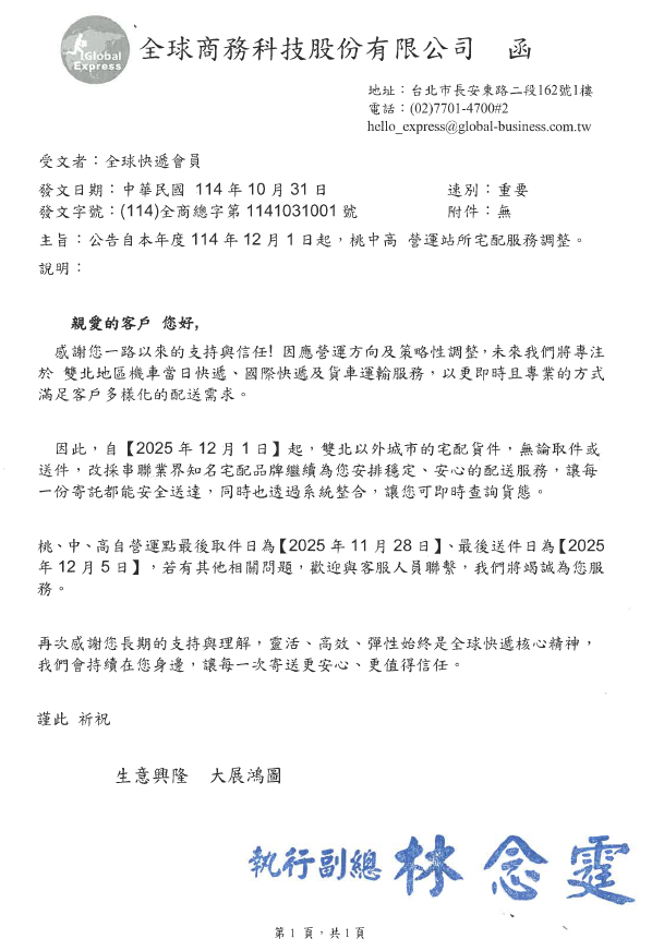桃中高站所宅配服務更動_最新消息 | 愛鄰快送介紹_愛鄰快送 | 全球快遞 Global Express : 連結社區的美好
